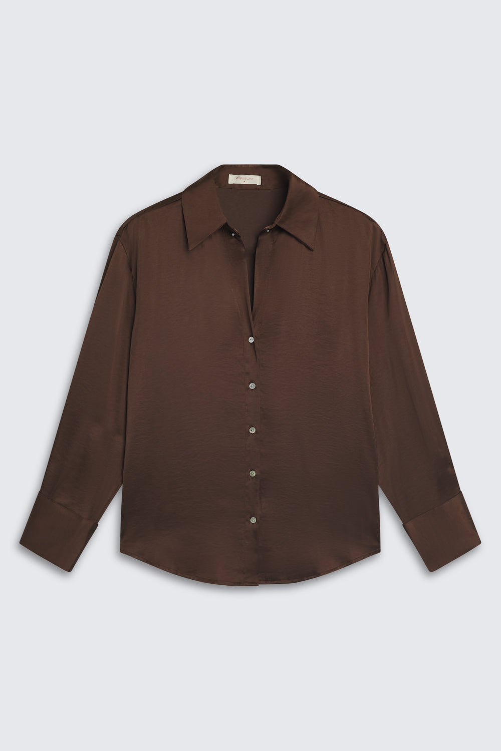 Blusa efecto raso con botonadura central. Puño ancho con dos botones.