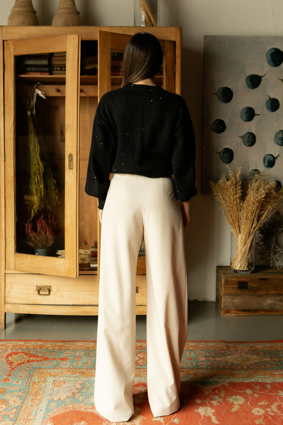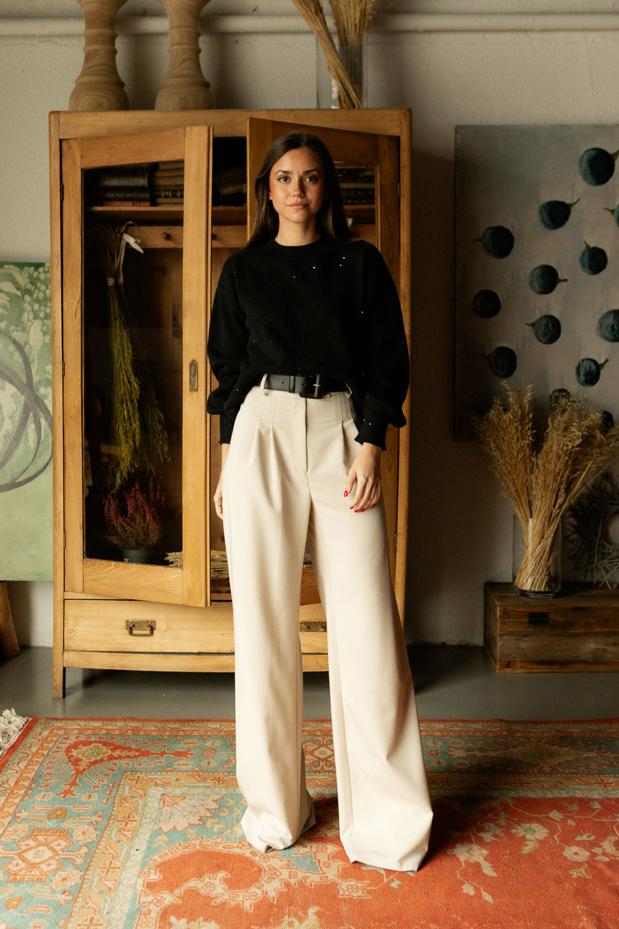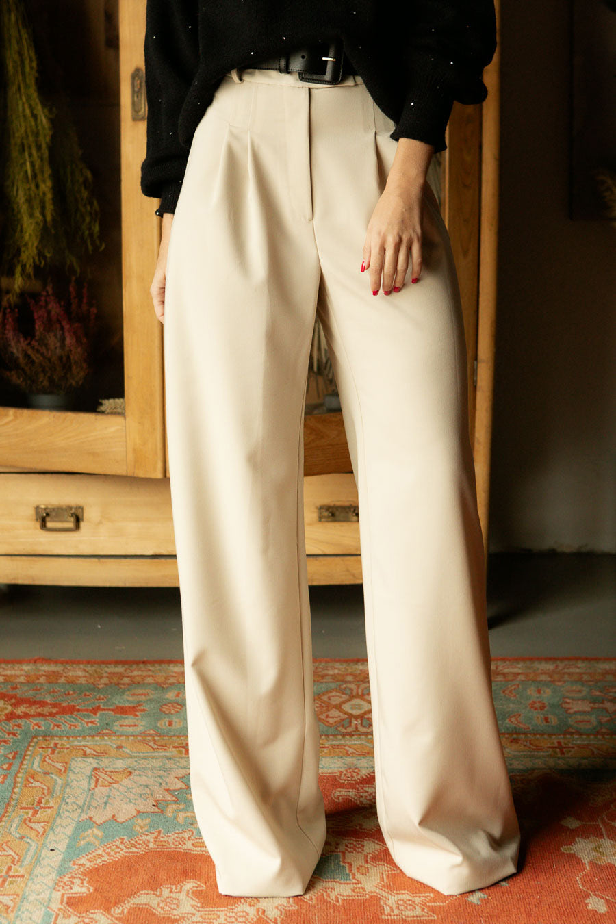 Pantalón de mujer de cintura alta en color beige. Diseño elegante con trabillas, cierre central con corchete y detalle de pinzas delanteras que aportan un ajuste favorecedor.