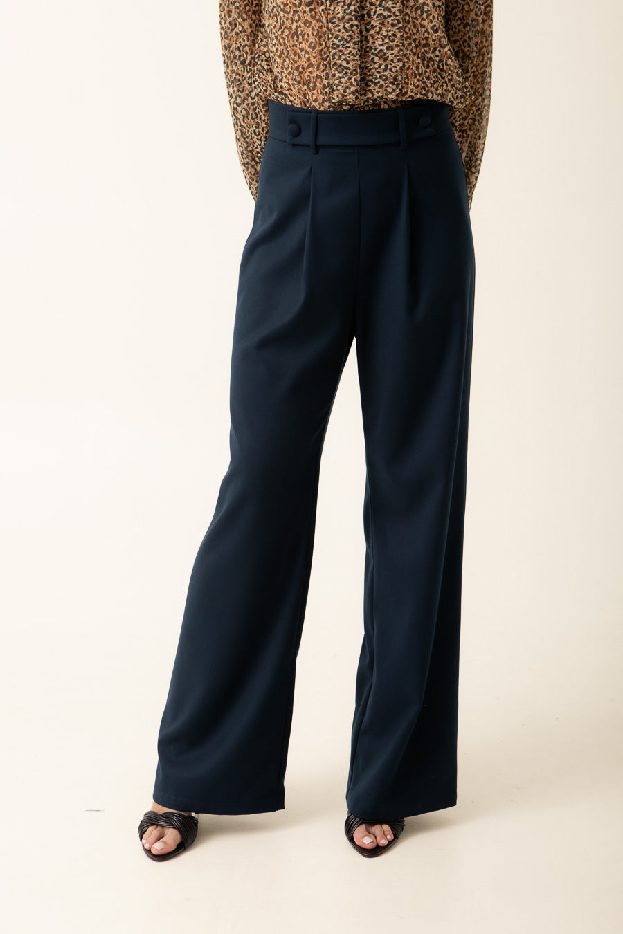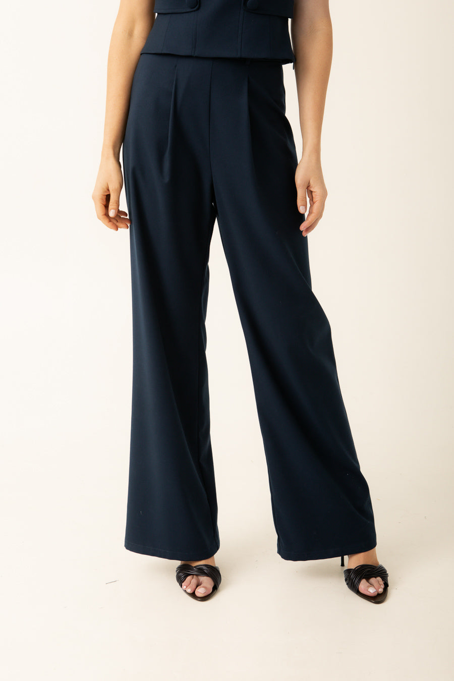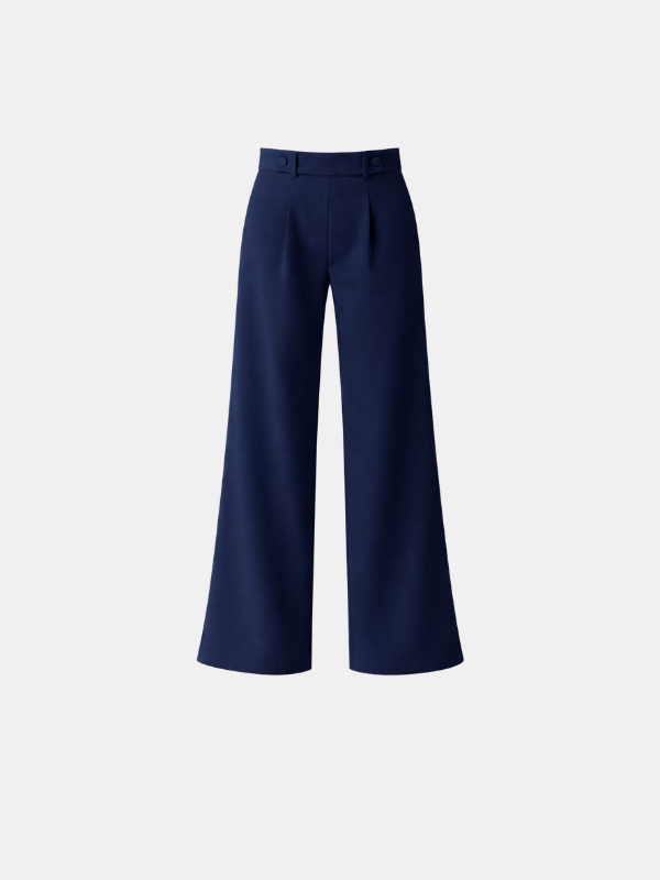 Este pantalón de pinzas de cintura alta en azul marino es una prenda esencial para cualquier armario moderno. Confeccionado con atención al detalle, su diseño estiliza la figura ofreciendo un ajuste elegante.