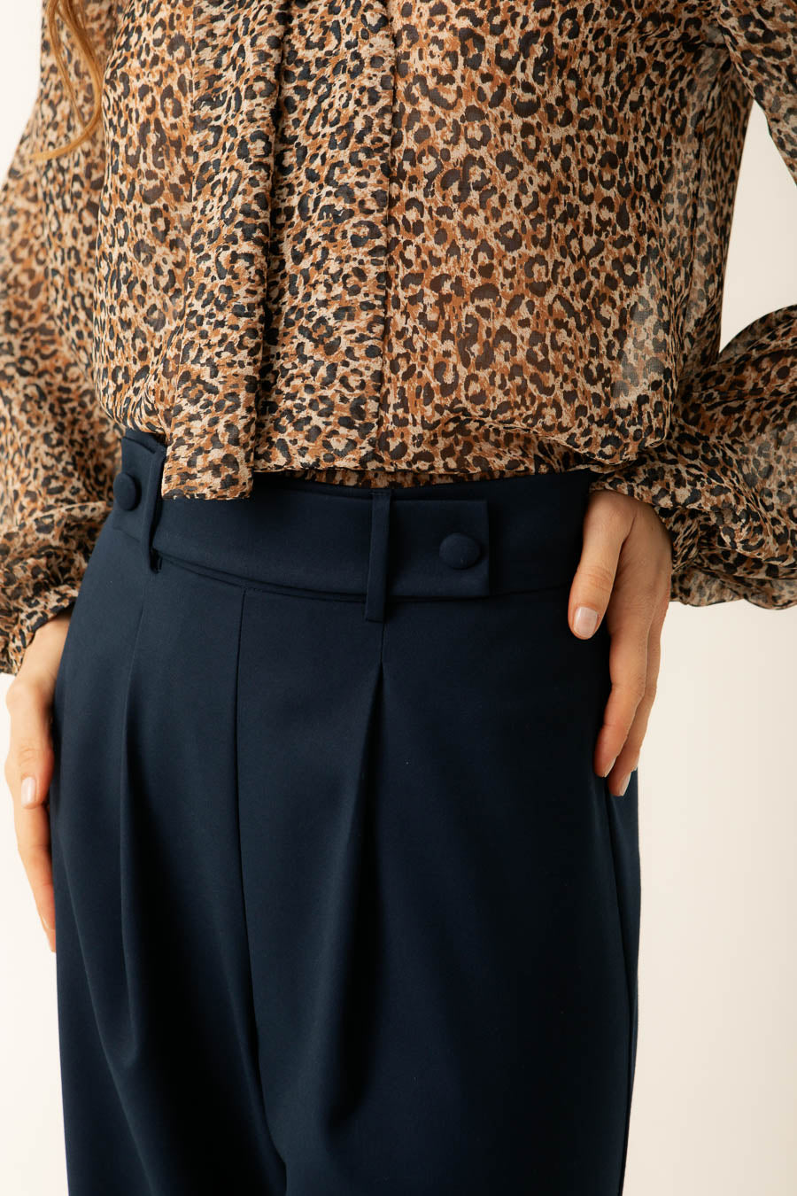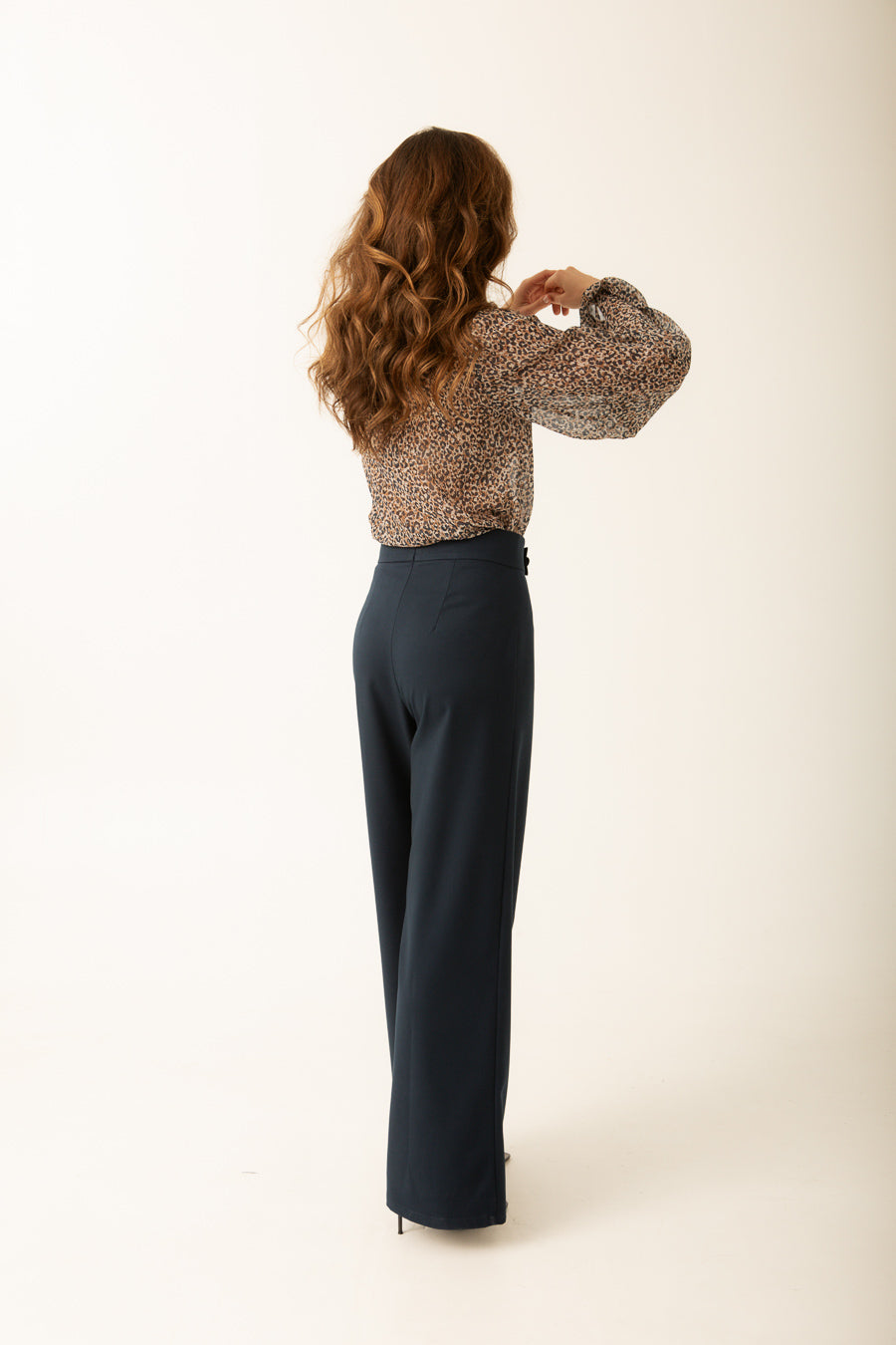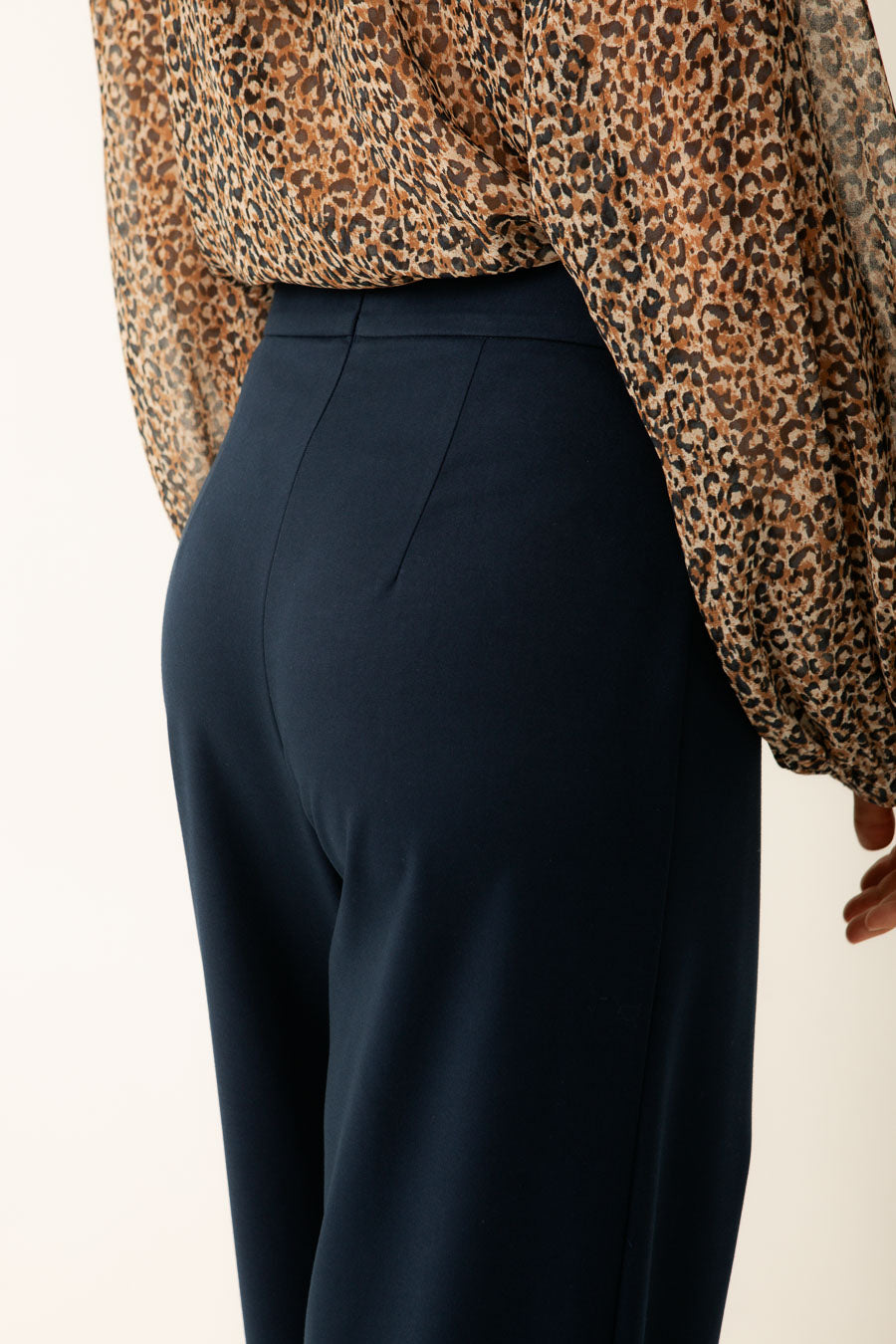 El cierre de cremallera invisible en la espalda asegura un acabado limpio, mientras que los botones forrados añaden un toque de sofisticación. Diseñado en España, este pantalón refleja la calidad y el estilo de la moda europea.