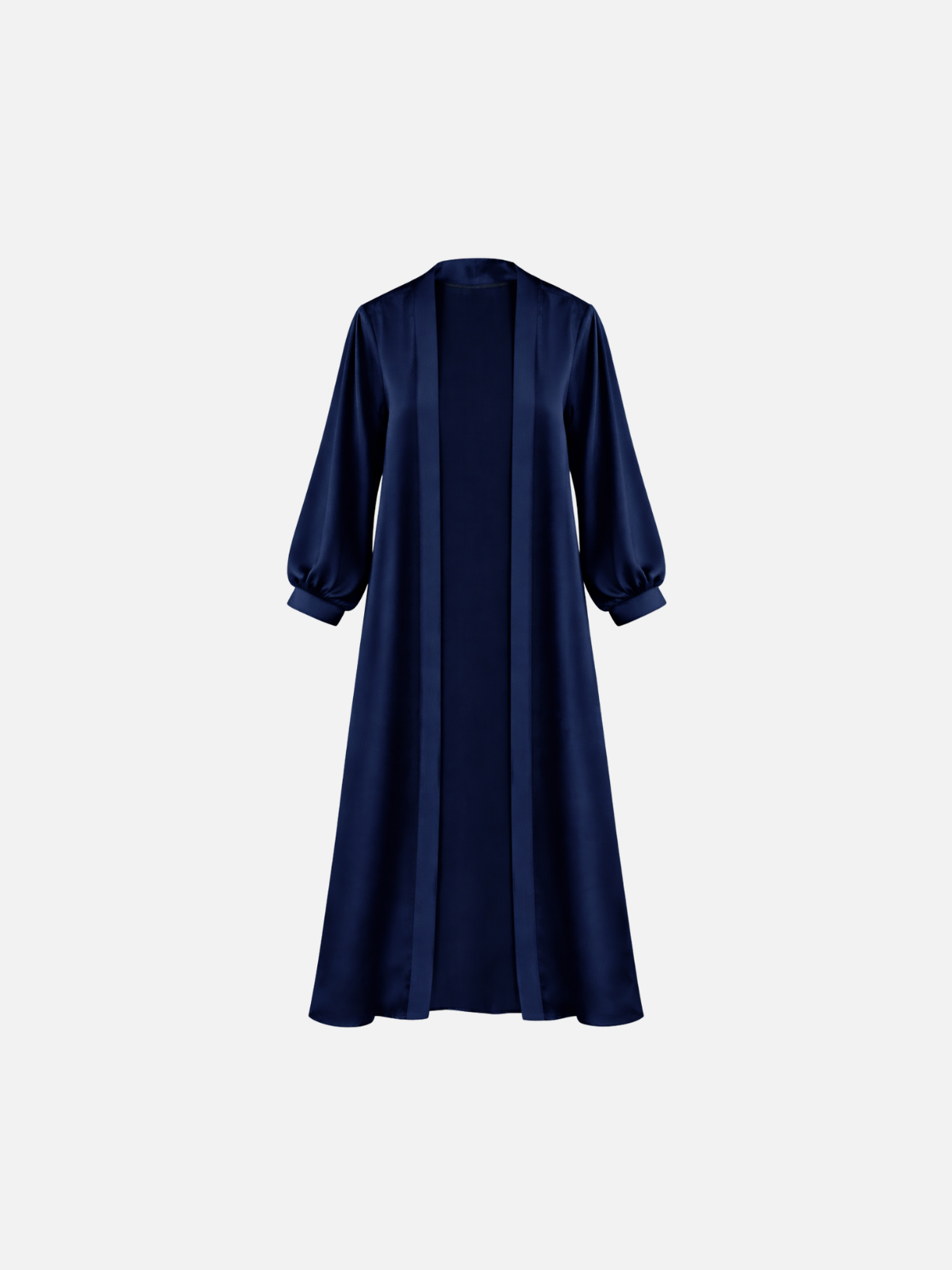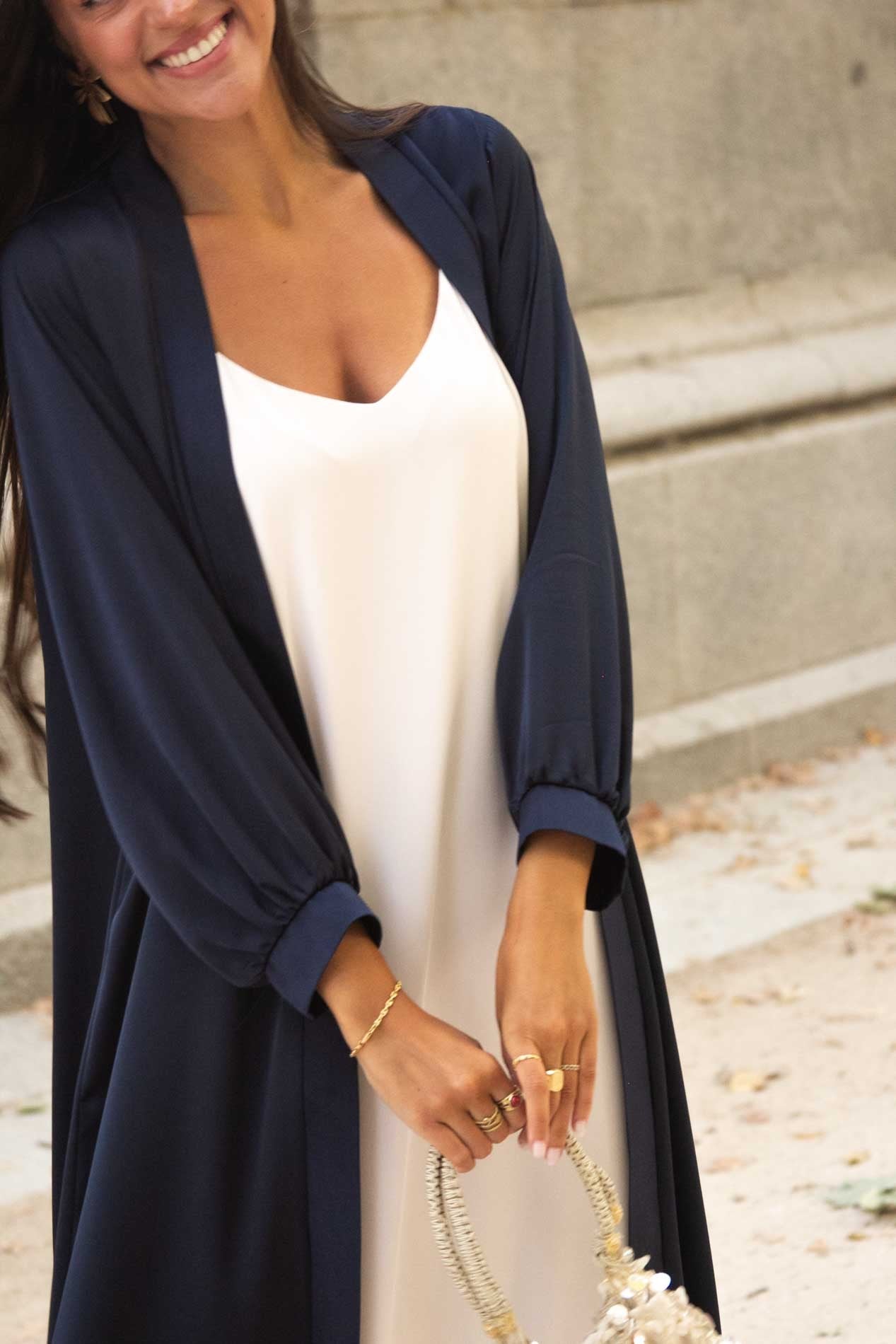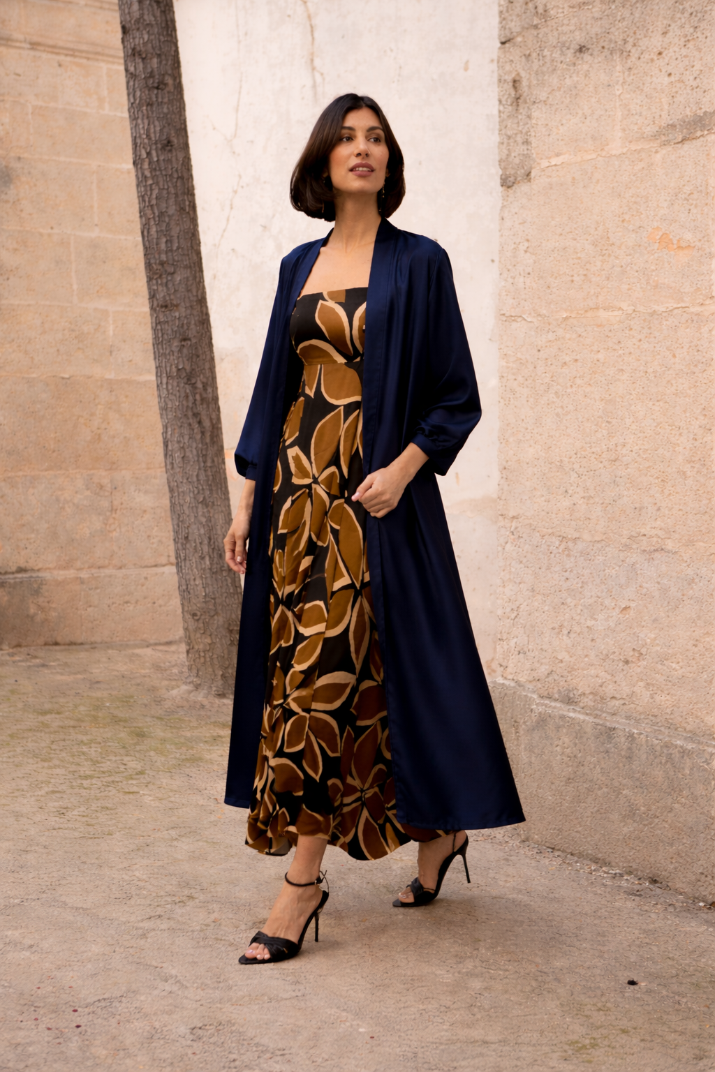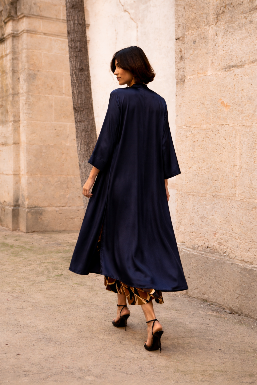 Kimono largo de elegancia atemporal confeccionado en color azul marino. Este kimono se caracteriza por su diseño sofisticado y corte recto, ideal para crear una silueta estilizada.