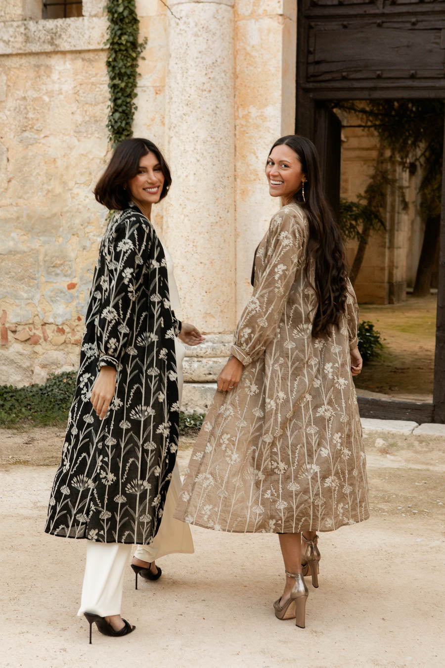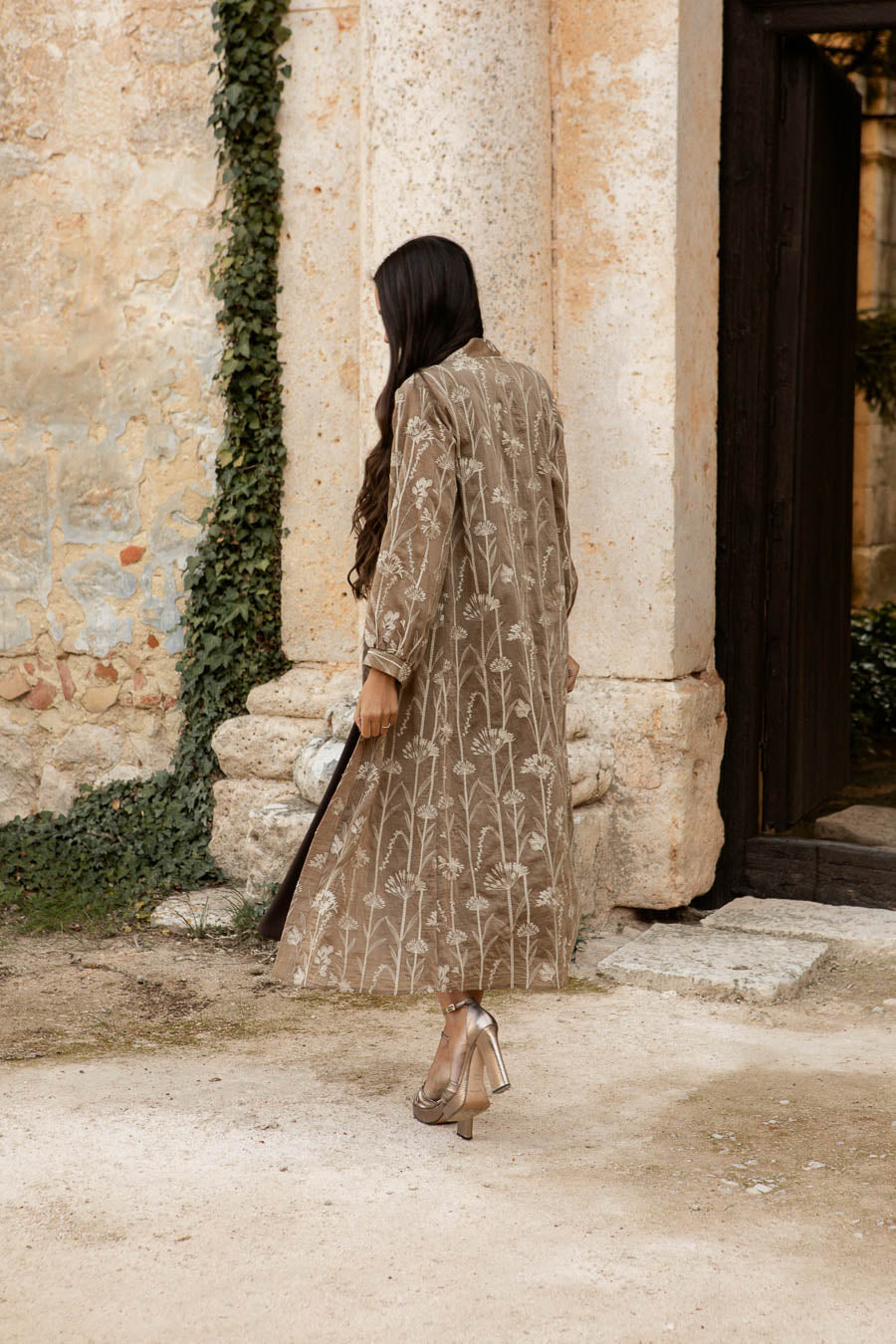 Kimono largo confeccionado en tejido bordado floral sobre un fondo beige, ofreciendo un aspecto sofisticado y elegante. Su diseño de manga con volumen culmina en puños, proporcionando un toque distintivo y moderno.