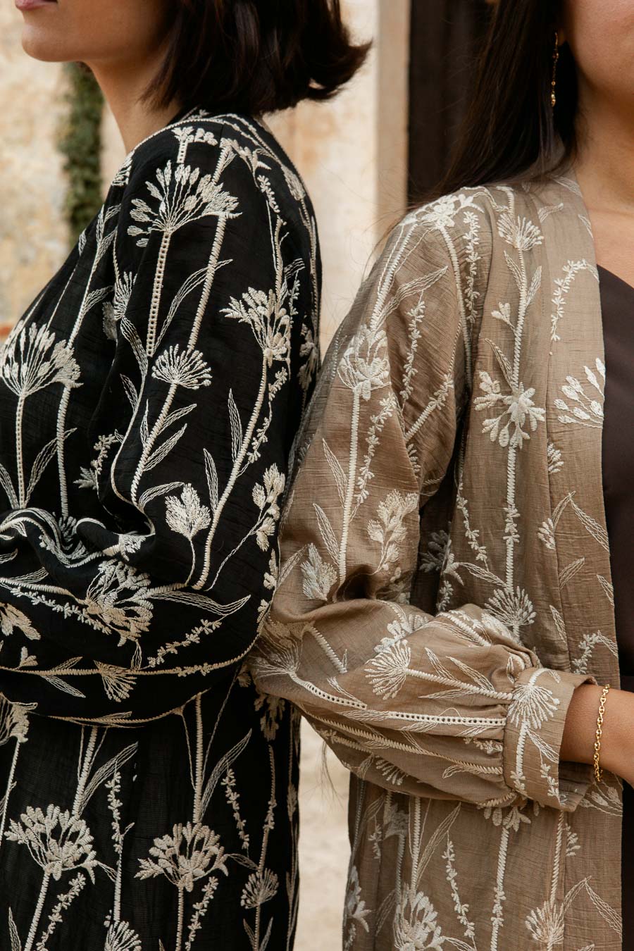 El corte del kimono es recto, permitiendo una caída fluida que estiliza la figura. Los detalles bordados aportan textura y un acabado detallado que realza la prenda, mientras que el tejido ligero asegura comodidad y movimiento.