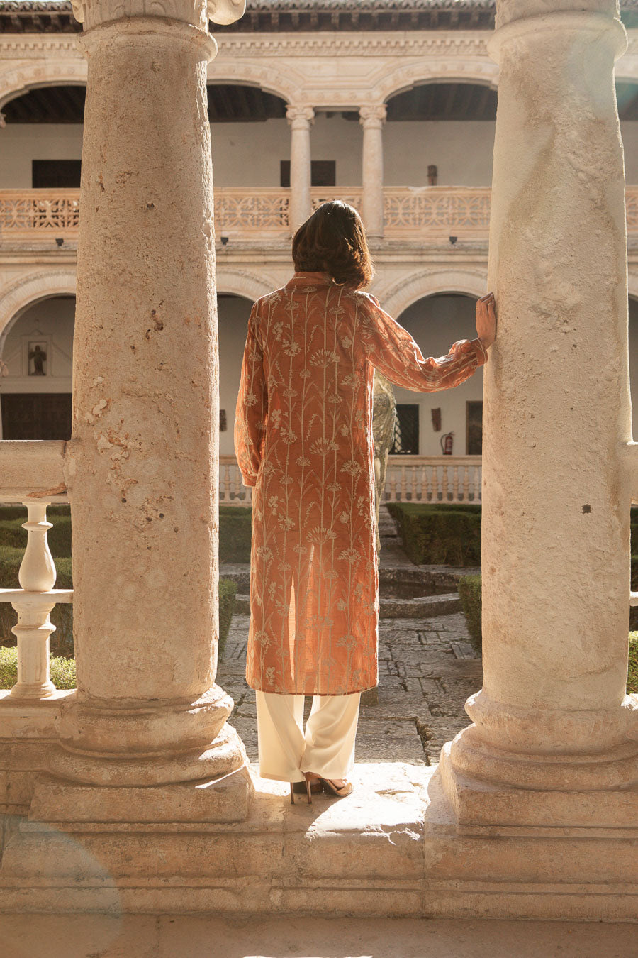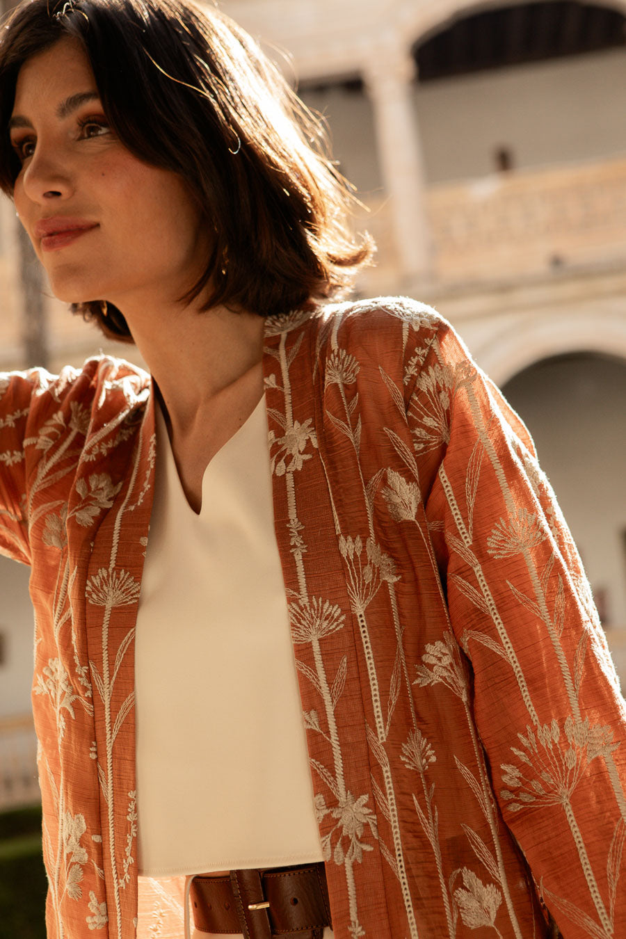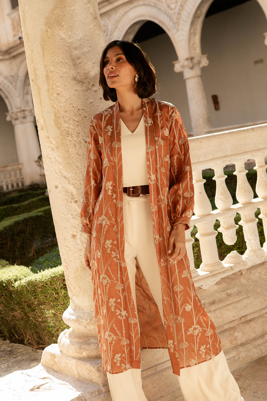 Kimono largo confeccionado en tejido bordado sobre un elegante fondo teja. Su corte recto aporta un estilo sofisticado y moderno, ideal para diversas ocasiones.