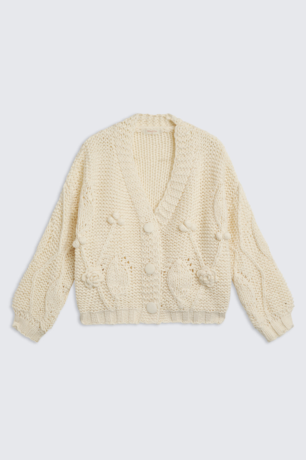 Chaqueta de punto grueso, cuello en pico y manga larga. Cierre frontal con botones forrados.