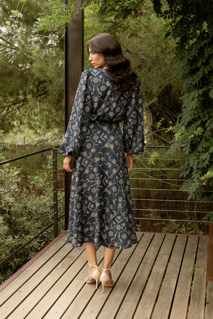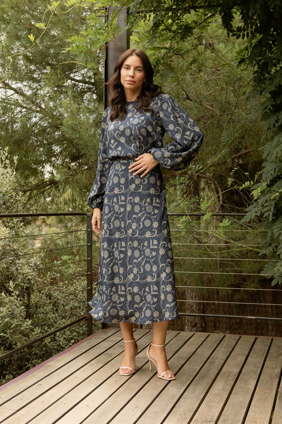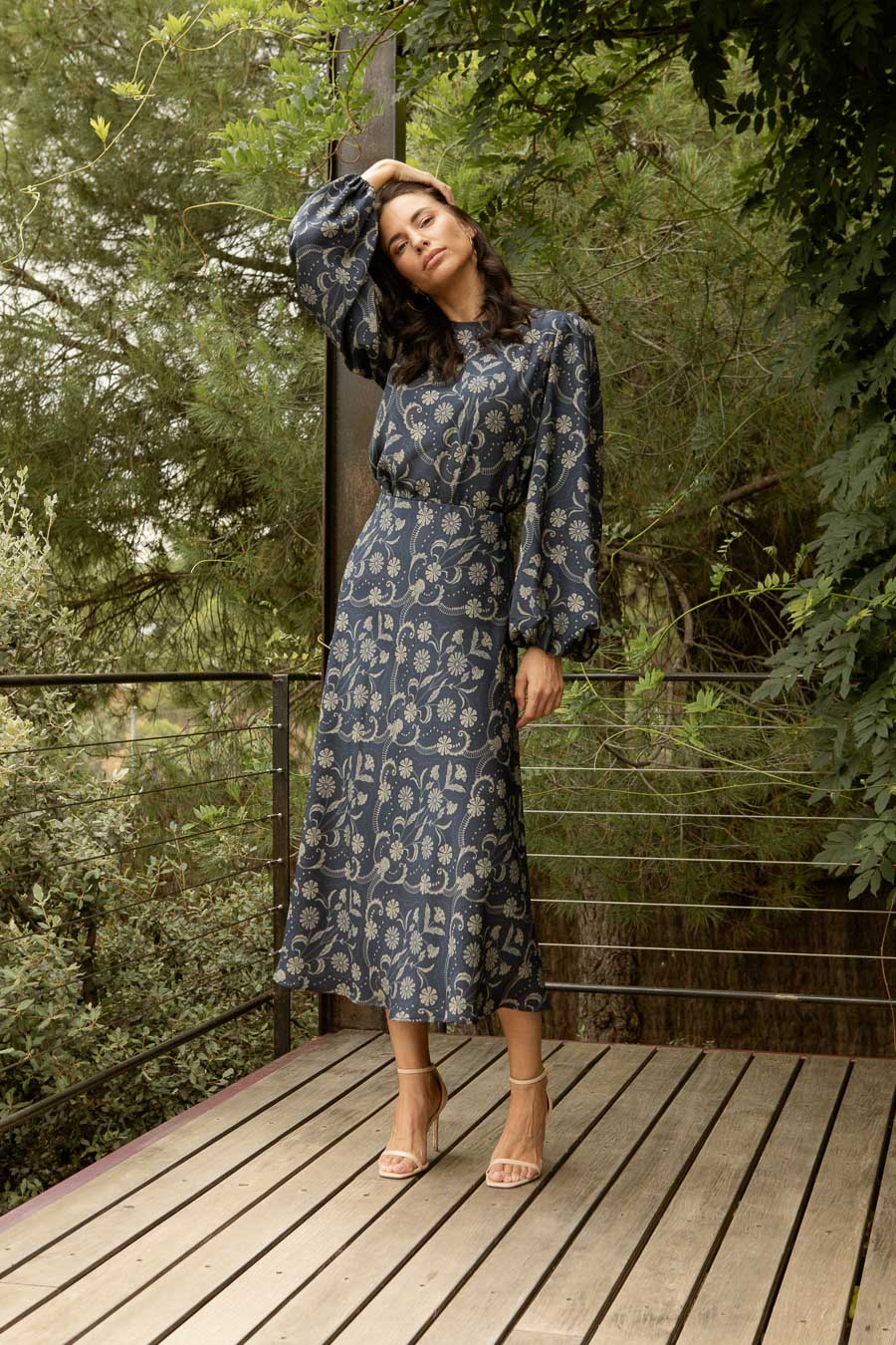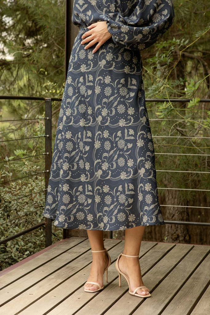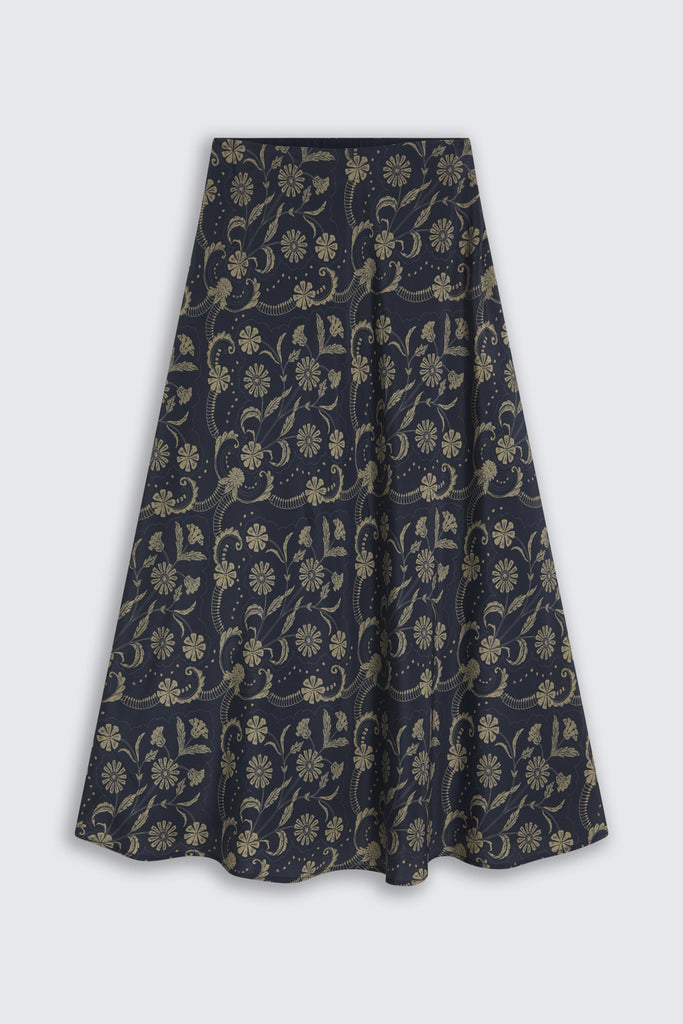 Falda midi de tiro medio confeccionada en gasa. Bajo asimétrico acabado en línea evasé. Cinturilla con goma elástica.