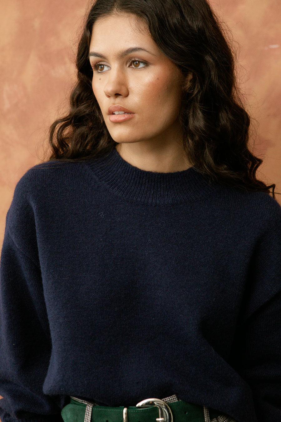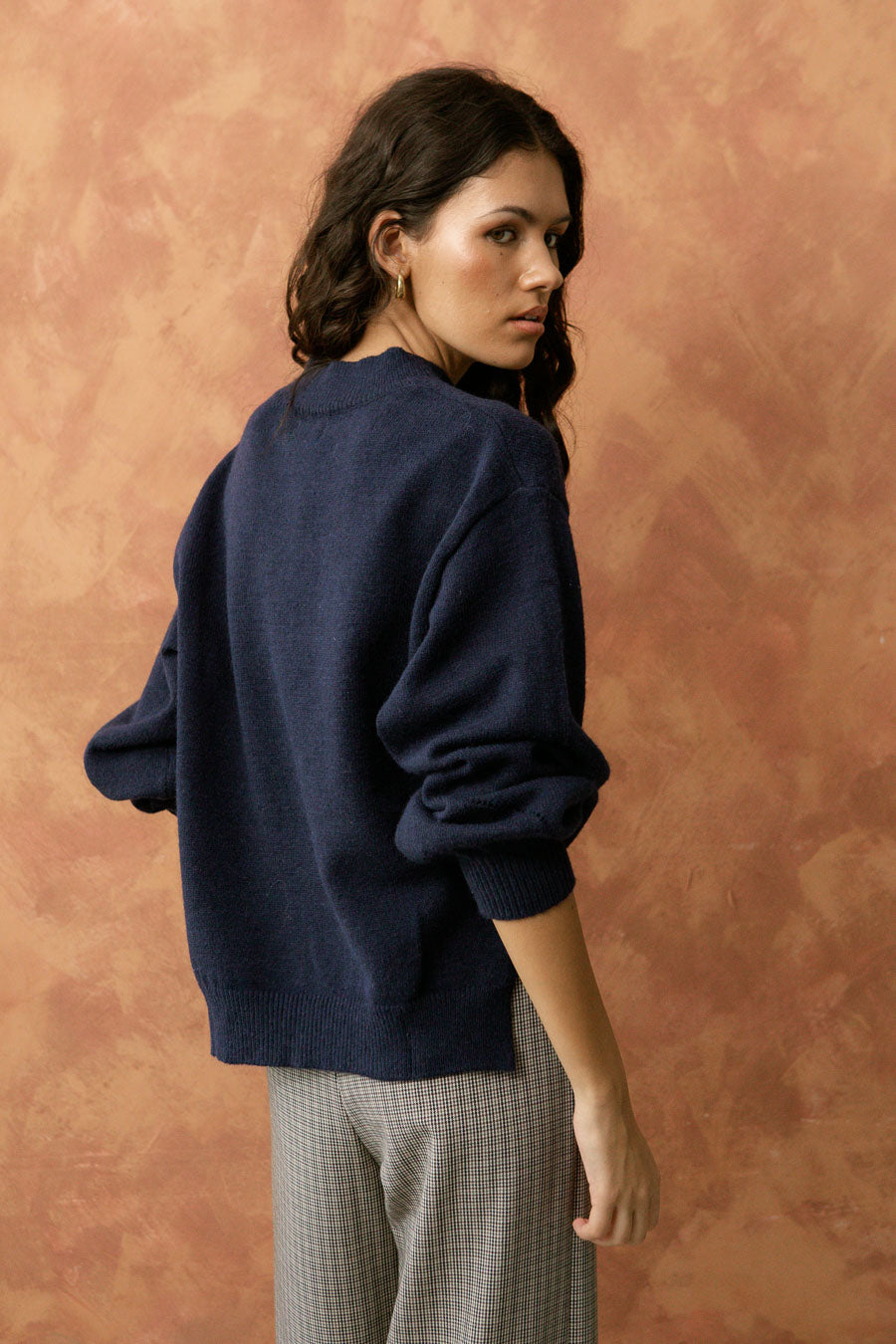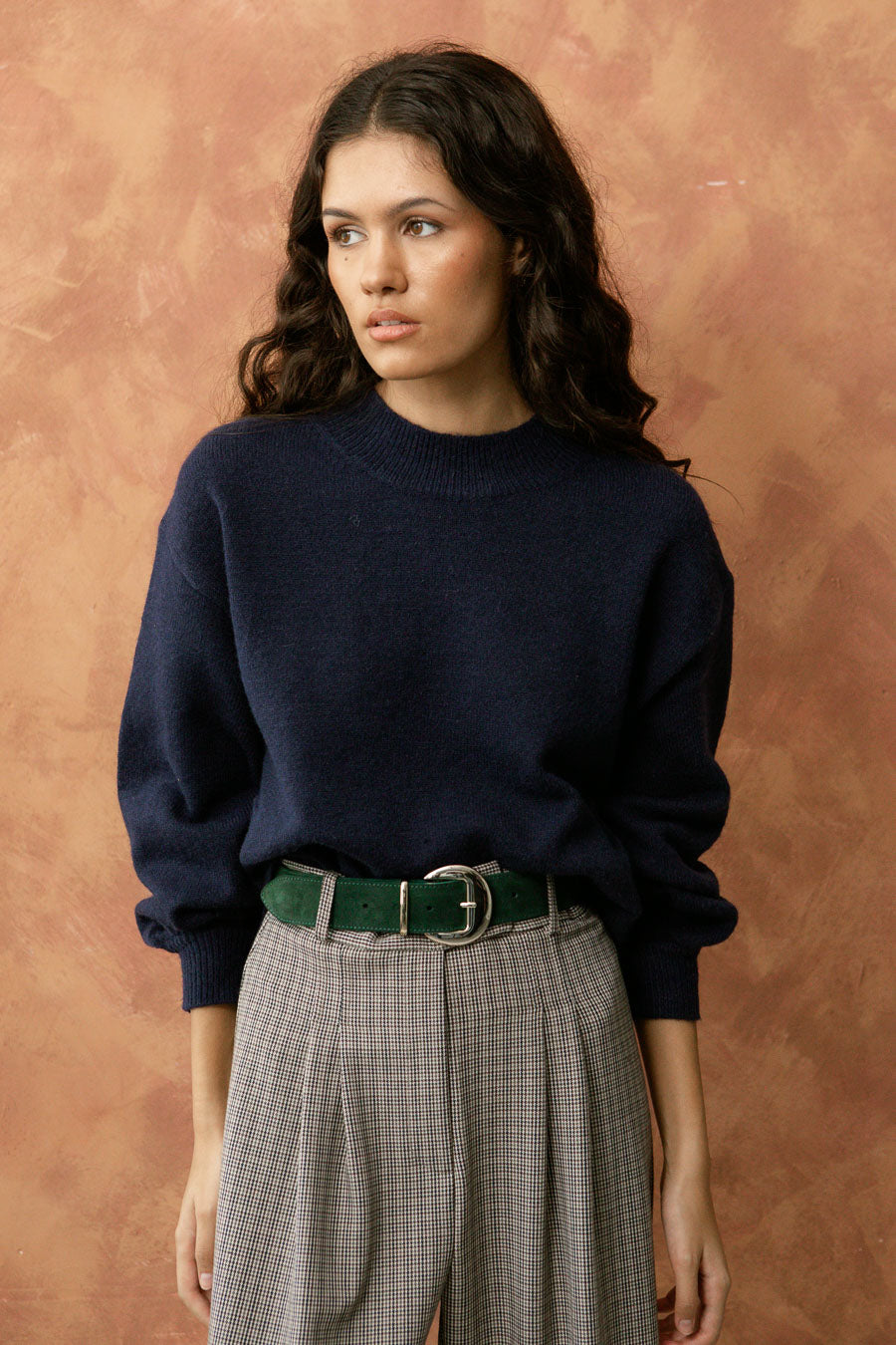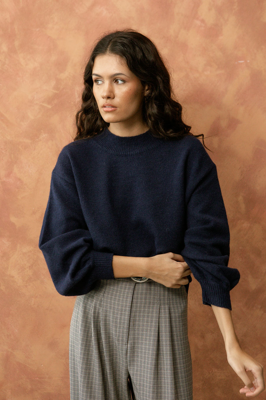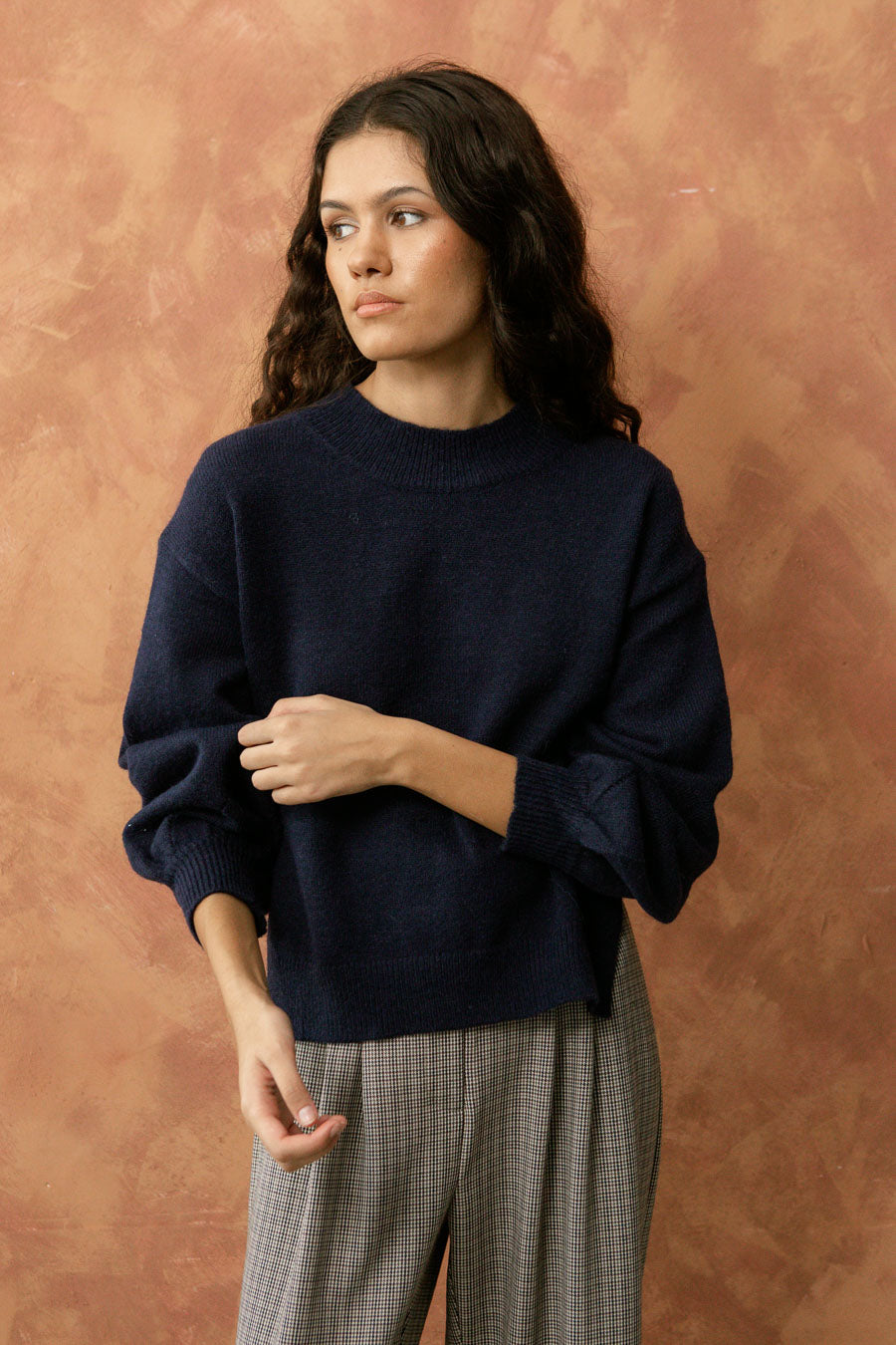 Jersey de cuello redondo subido. Manga abullonada. Aberturas laterales.