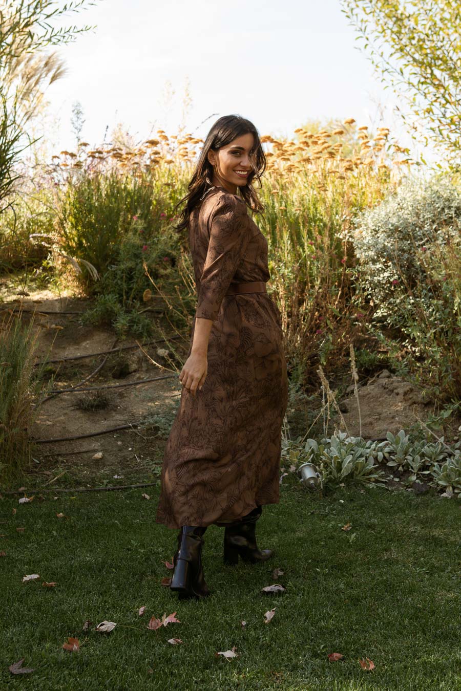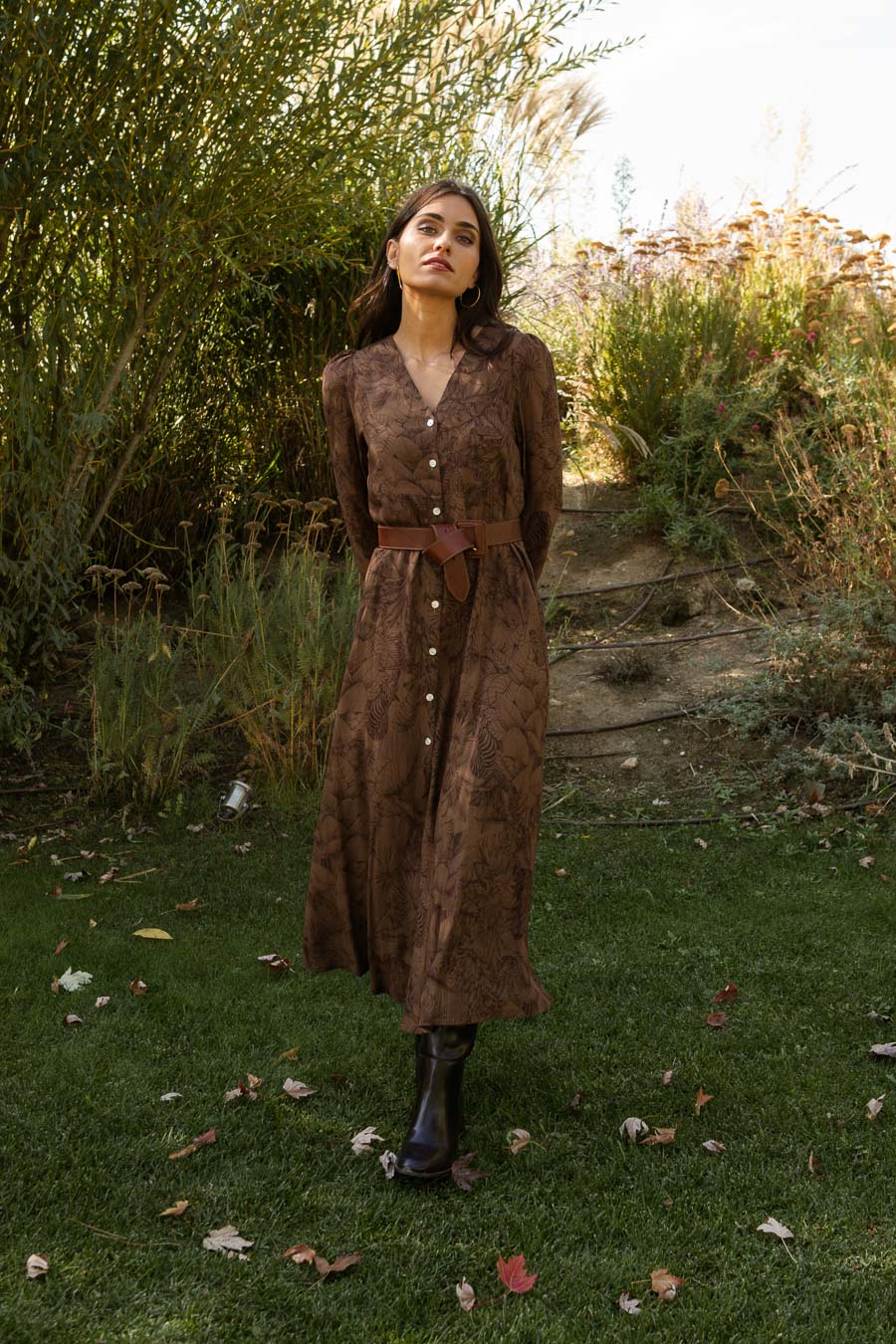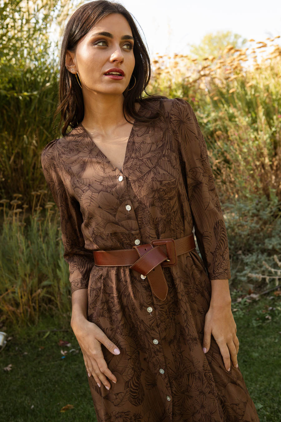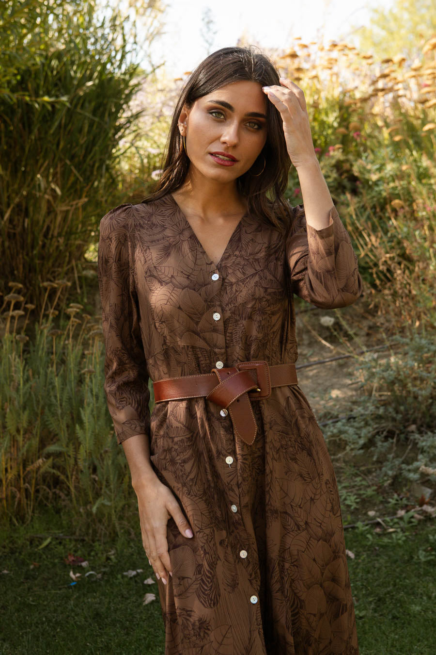 Vestido estampado midi confeccionado en viscosa. Cuello en pico y manga larga .Costura debajo del pecho. Cierre frontal con botones.