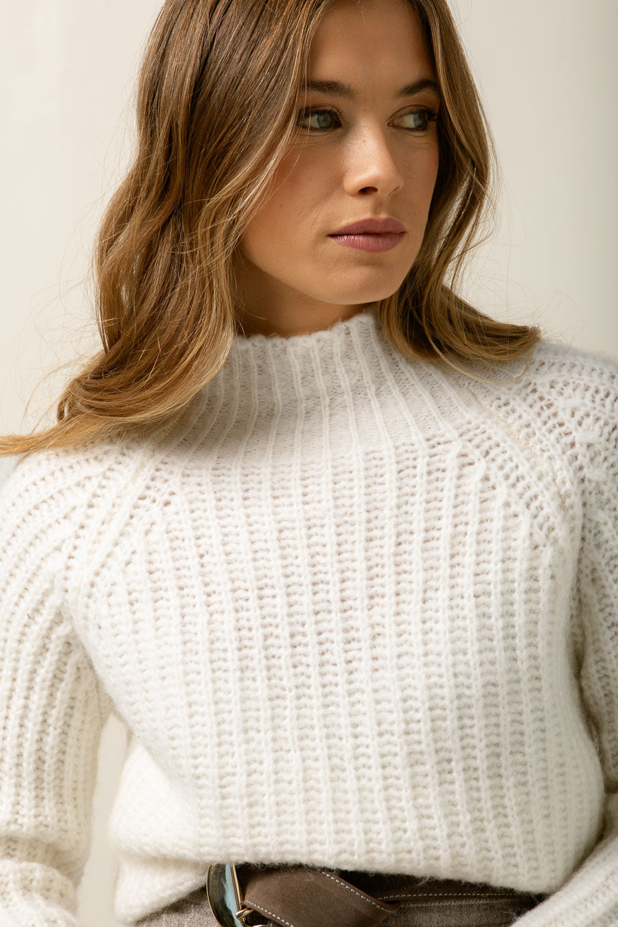 Jersey de cuello subido con efecto canalé. Manga media acampanada.
