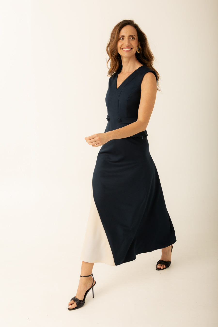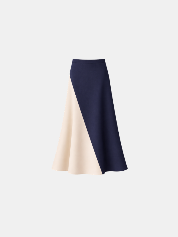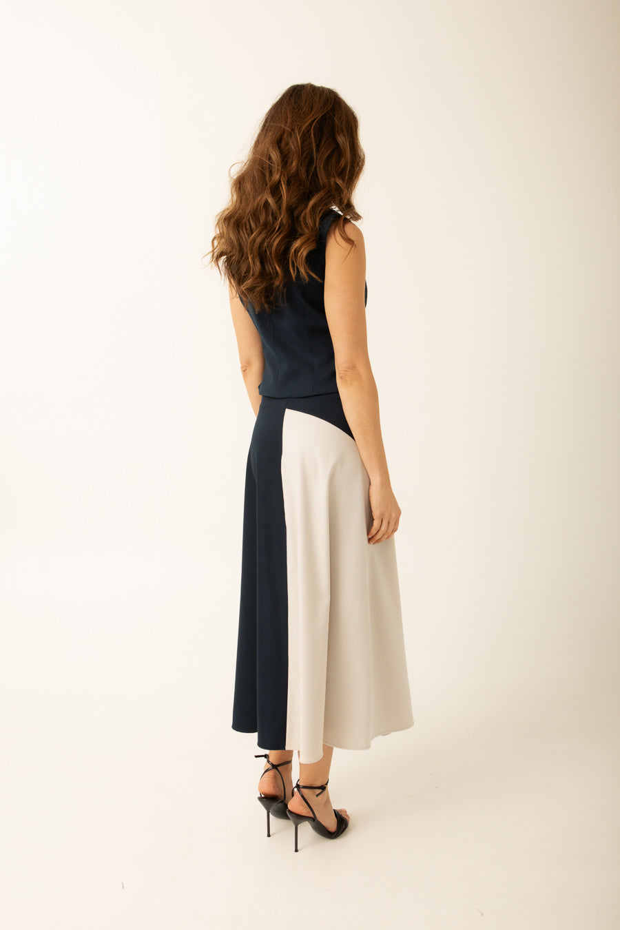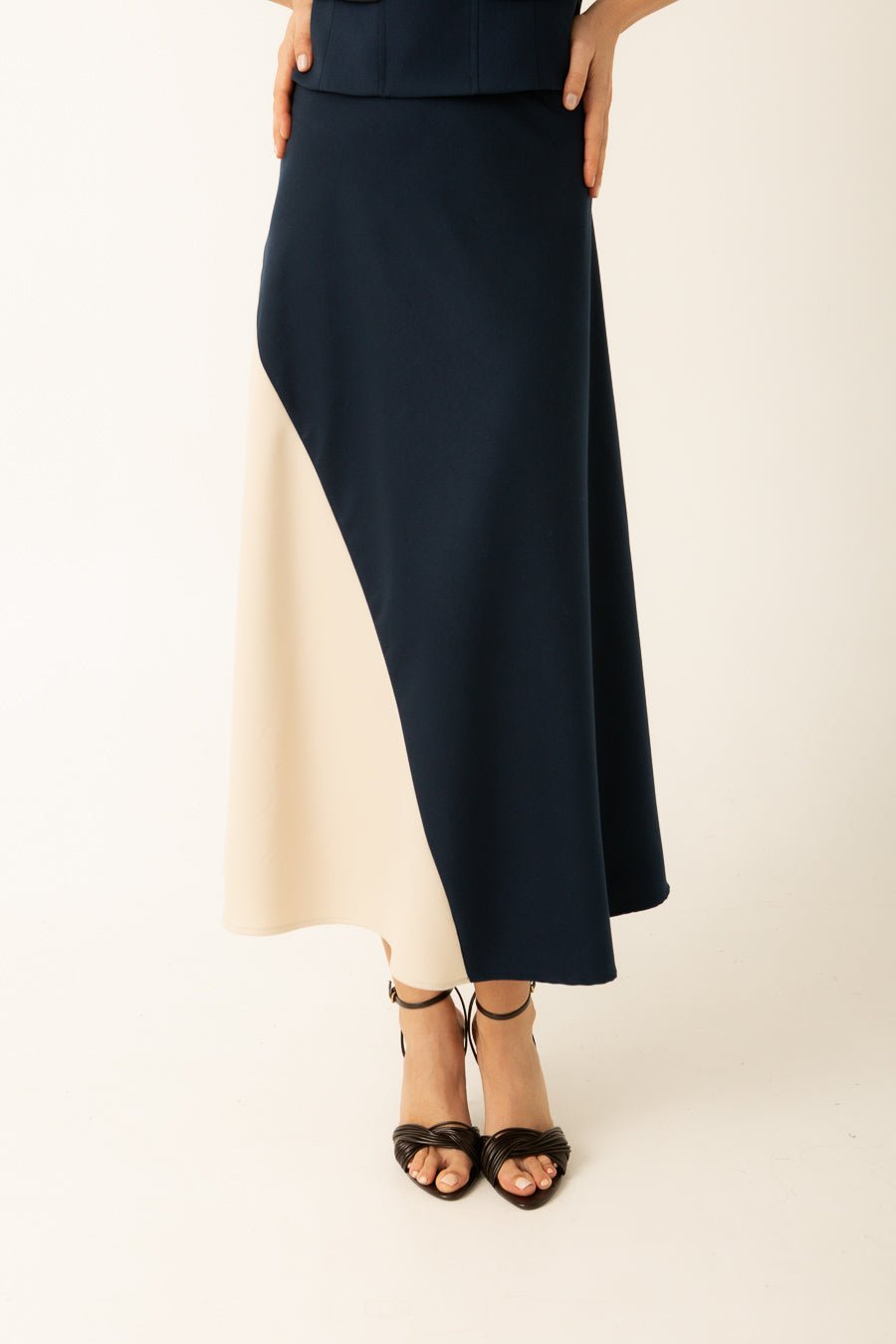 Falda midi de diseño elegante y contemporáneo que combina dos tonos atemporales: azul marino y beige. Su diseño bicolor con corte diagonal crea un contraste sofisticado que estiliza la silueta y aporta movimiento a la prenda.