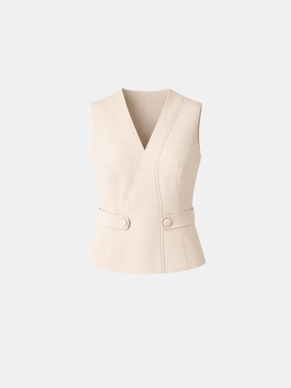 Top de corte estructurado en elegante tono beige, diseñado para realzar la silueta con un aire sofisticado y contemporáneo. Su escote en pico y las costuras marcadas en el delantero estilizan la figura y aportan un acabado limpio y favorecedor.